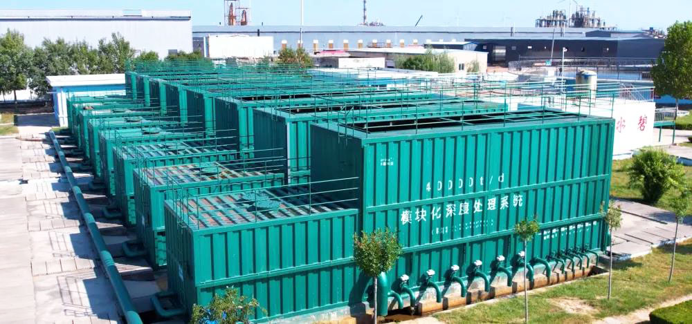 污水厂分为三级处理,分别是预处理-生化处理-深度处理。预处理主要去除污水中的大颗粒悬浮物和泥沙。生化处理阶段采用A/A/O工艺,使得污水中的污染物在微生物的作用下被降解和转化为污泥。深度处理就是利用模块化深度处理设备对二沉池出水进行絮凝、沉淀、过滤等深化处理,进一步去除有机污染物并通过消毒剂对污水进行消毒。深度处理模块采用了模块化水处理新工艺技术。